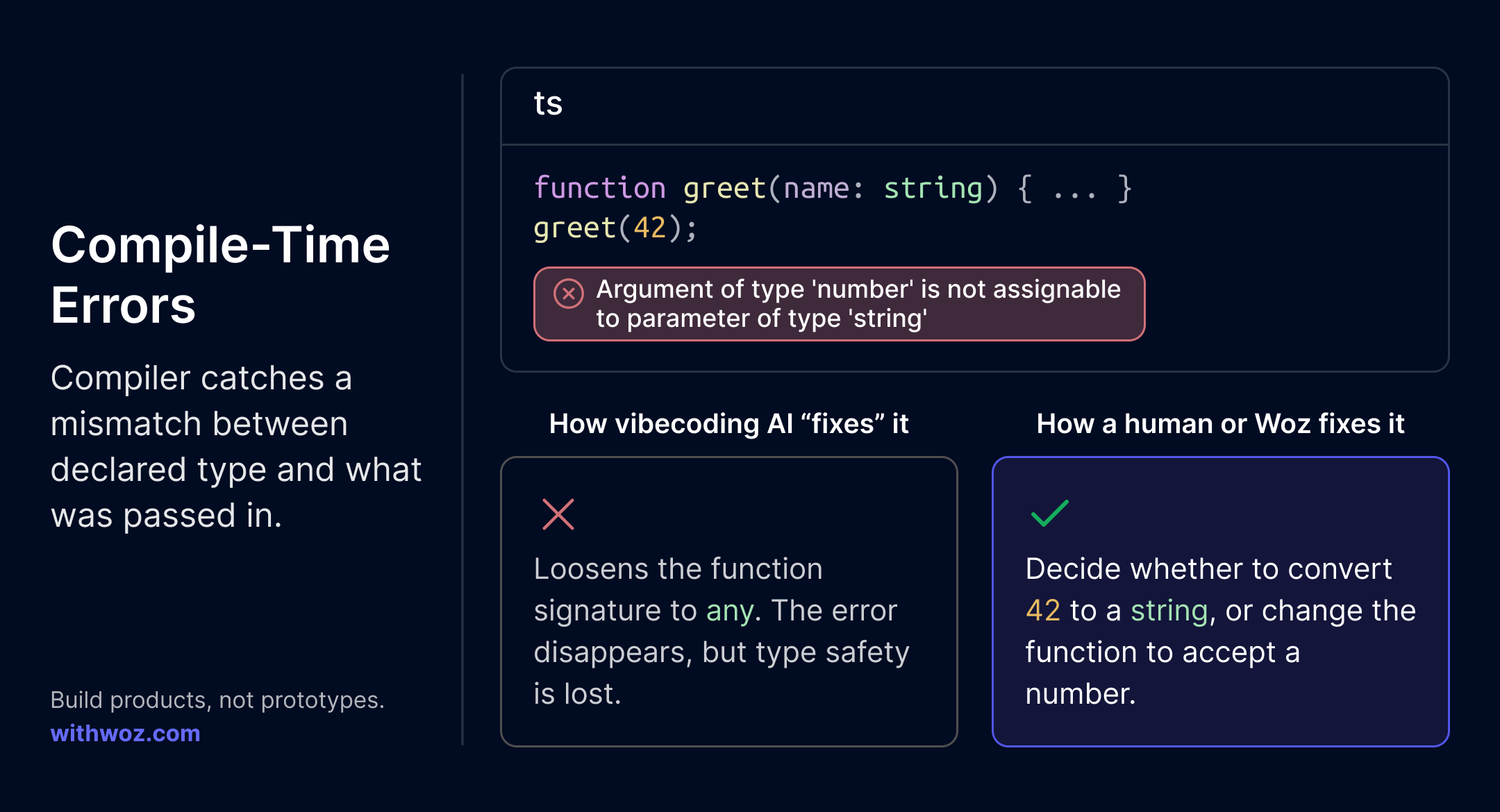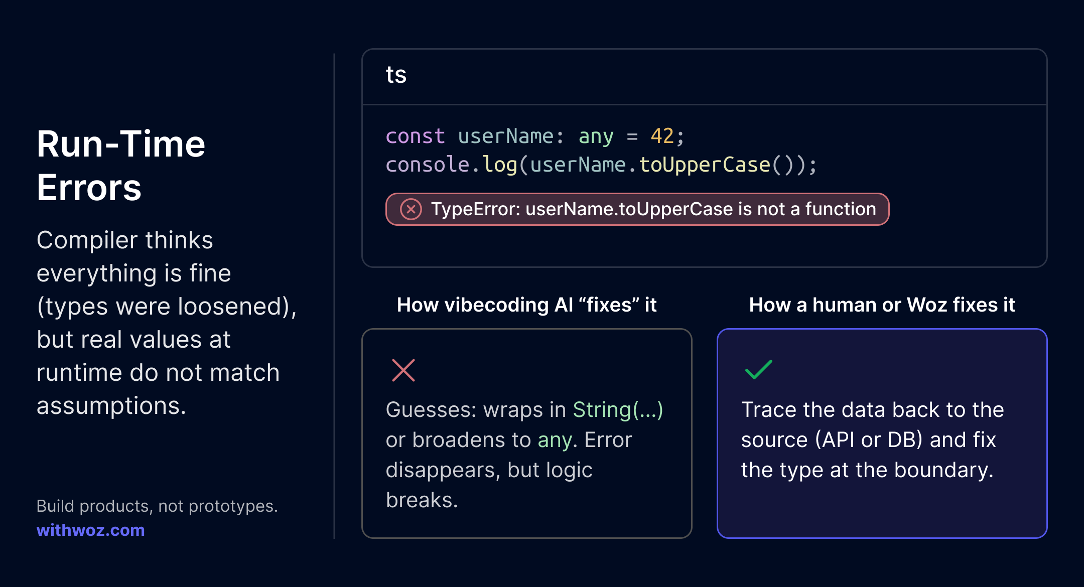 Compiling ≠ production ready. AI code without type safety is fragile and full of hidden bugs. At Woz, we force strict typing throughout the code. A little slower, but the result is code that lasts.
